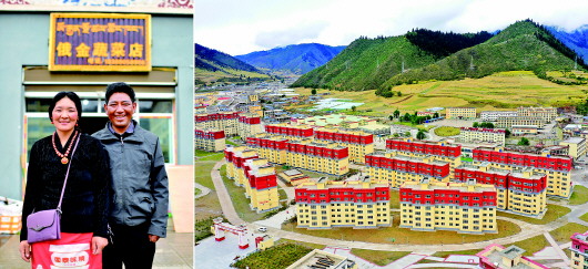拼版照片:左图为西藏自治区昌都市类乌齐县长毛岭乡达雄村村民俄金(右)和妻子阿丁在安置点俄金蔬菜店前(9月22日摄);右图为类乌齐县桑多扶贫开发区易地扶贫搬迁安置点一角(9月22日摄)。