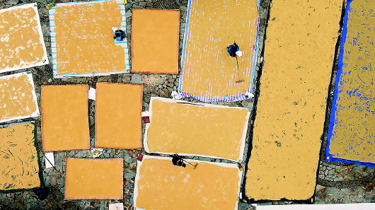 10月7日,贵州省黔东南苗族侗族自治州雷山县郎德苗寨,村民在晾晒稻谷。寒露将至,各地农民抢抓农时开展农事活动。  新华社发(蔡兴文摄)