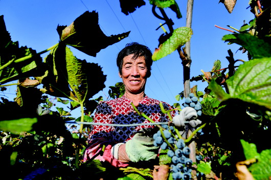 马鞍山村村民在葡萄园采摘山葡萄。摄于2019年9月。  新华社记者刘磊摄