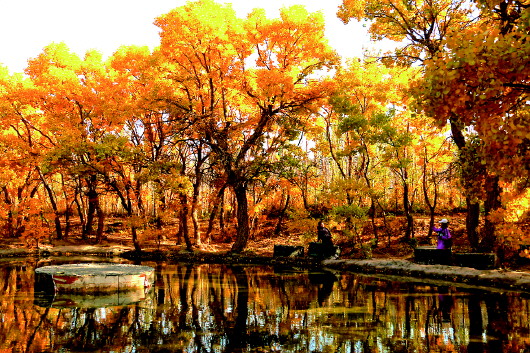 10月10日,游客在甘肃省敦煌市莫高镇的胡杨林中游玩。金秋十月,莫高镇的胡杨林尽染秋色,美不胜收。 新华社发(张晓亮摄)