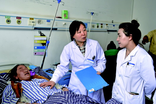 ▲2019年4月12日,北京市西城区妇幼保健院妇产科副主任医师、援青专家裴志飞医生(左二)在查看病人过程中给玉树州人民医院妇产科医生讲解病情。本报记者张龙摄 |