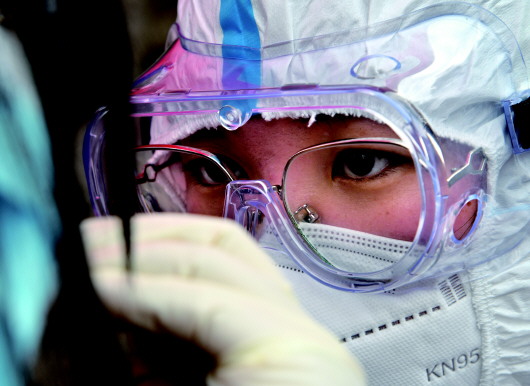 10月13日,工作人员在青岛大学体育场检测点为学生进行核酸检测采样。记者13日从青岛市政府新闻办召开的新闻发布会上获悉,青岛市目前共有万余名医务人员进行全员核酸检测工作,截至13日15时30分,青岛市已采样4235438份,已出结果1945252份,除已公布的6例确诊病例和6例无症状感染者外,未发现新增阳性感染者。 新华社记者李紫恒摄