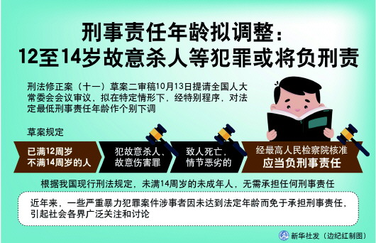 一段时间来,社会各界对修改刑法、调整法定刑事责任年龄的呼声日益高涨。刑法修正案(十一)草案二审稿对此作出回应,明确提出:已满12周岁不满14周岁的人,犯故意杀人、故意伤害罪,致人死亡,情节恶劣的,经最高人民检察院核准,应当负刑事责任。