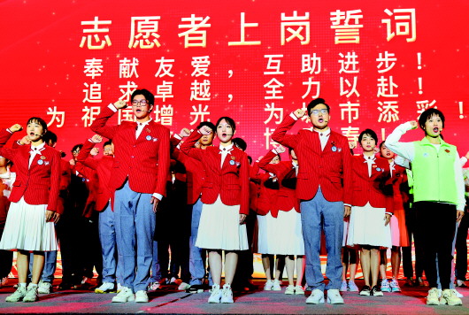 10月18日,第三届进博会志愿者在仪式现场宣誓上岗。 新华社记者刘颖摄 |