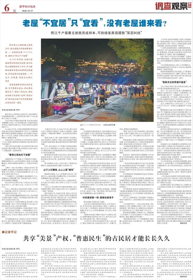 记者在西江苗寨景区采访时,看到壮观的吊脚楼群,听着村民们的不同声音,不禁思考“西江模式”中民居、民俗与民生的关系。