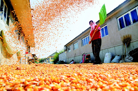 10月19日,莱西市官庄村村民张淑萍在晾晒玉米。山东青岛340多万亩玉米喜获丰收,田间地头、村居庭院金黄遍地。 新华社记者李紫恒摄