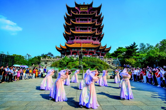 ▲游客在湖北武汉黄鹤楼景区观看演出(10月1日摄)。