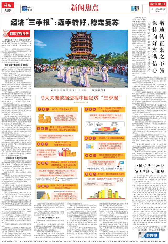 中国前三季度经济“成绩单”19日出炉,前三季度中国经济增长由负转正。新冠肺炎疫情全球大流行、世界经济陷入衰退之际,中国经济实现正增长难能可贵,也为世界经济注入正能量。