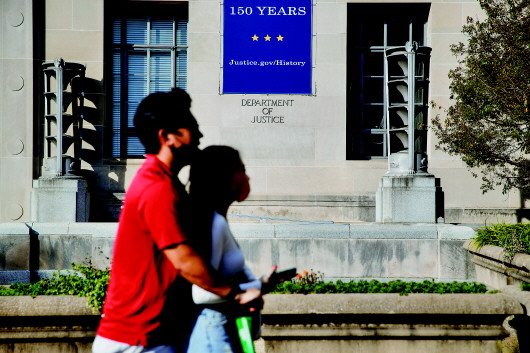 10月20日,人们走过美国华盛顿的美国司法部大楼。