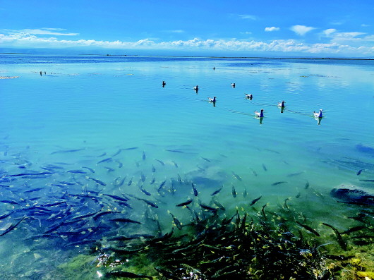 2019年9月11日拍摄的青海湖水鸟和裸鲤。 新华社记者李琳海摄 |