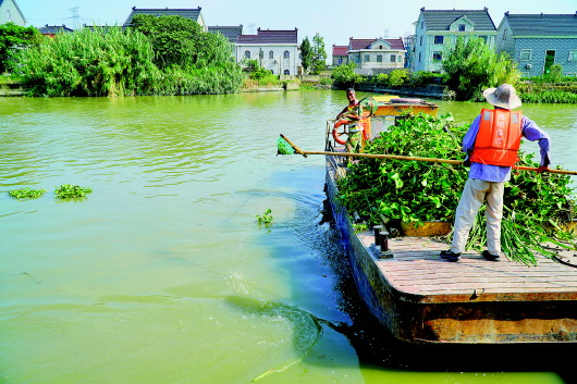 麻溪港上,保洁人员正在打捞水葫芦。