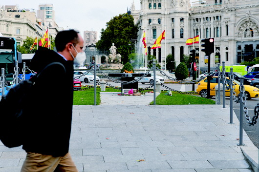 十月二十一日,在西班牙马德里,行人佩戴口罩经过新冠病亡者纪念火炬。 新华社记者孟鼎博摄 |