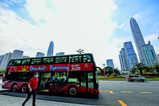 深圳巴士集团旅游观光巴士10月22日正式开通,将开行以人文、科技生态、灯光夜景为主题的红、蓝、黄3条线路。新华社记者毛思倩摄