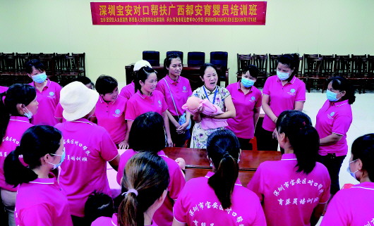 深圳对口帮扶的广西河池市都安瑶族自治县易地扶贫搬迁点居民接受育婴培训(2020年7月10日摄)。