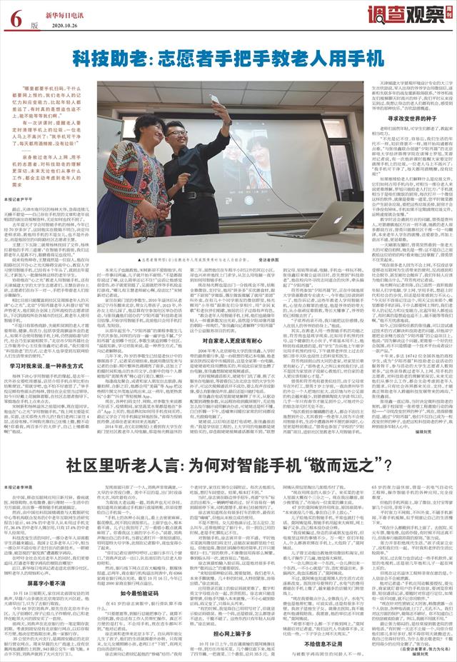 天津城建大学景观环境设计专业的大三学生吉欣喆说,军人出身的爷爷学会用微信后,逐渐和失联多年的战友重新取得联系。“爷爷和战友们视频聊天时高兴的样子,我们平时从来没见到过。我想让身边的老人们都有机会,感受到爷爷的那种快乐。”吉欣喆感慨道。