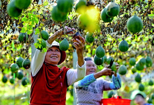 江西省抚州市临川区桐源乡的农户在瓜蒌子产业扶贫示范基地内采摘成熟的瓜蒌(10月22日摄)。目前,江西省抚州市临川区桐源乡瓜蒌大面积成熟,当地农户正在加紧采摘。据了解,近年来,桐源乡通过“公司+合作社”的模式,重点打造400亩瓜蒌子产业扶贫示范基地,辐射全乡77户精准扶贫户,每亩年产值超过6600余元,小瓜蒌为当地农民铺就了一条增收之路。 新华社记者彭昭之摄