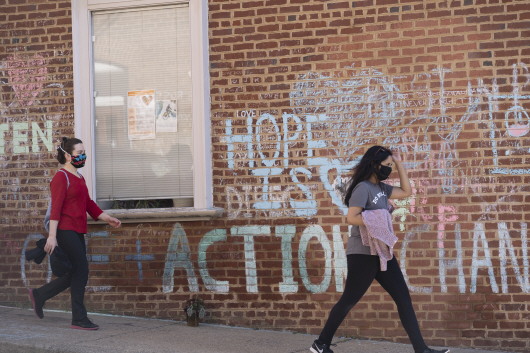 在夏洛茨维尔市的一面红色砖墙上,写满了纪念在当年骚乱中丧生的32岁反极右翼示威者希瑟·海尔的标语,还有一些呼吁爱、友善、团结的留言。