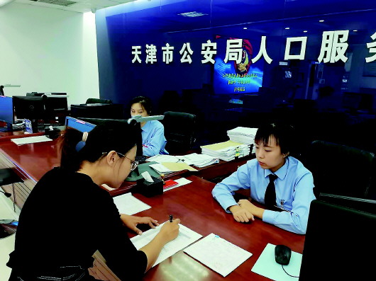 天津市民政局事业处工作人员朱娜(左一)在天津市公安局人口管理总队为受助人员办理落户手续。 |