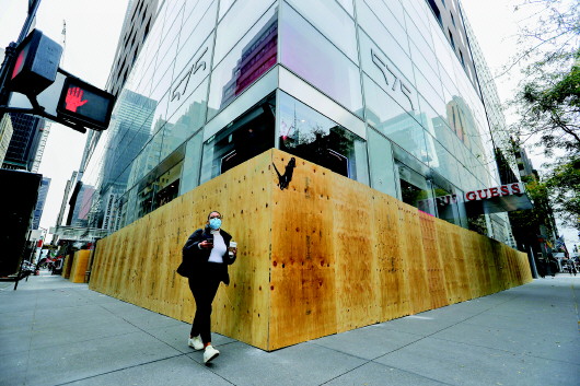 11月1日,在美国纽约第五大道,一名女子从一家安装了防护板的商店旁走过。由于担心发生骚乱带来损失,纽约不少商店和写字楼开始加强防护和安保。新华社记者王迎摄 |