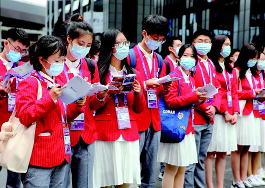 第三届中国国际进口博览会的志愿者进入国家会展中心(上海)熟悉场地(10月28日摄)。 新华社发
