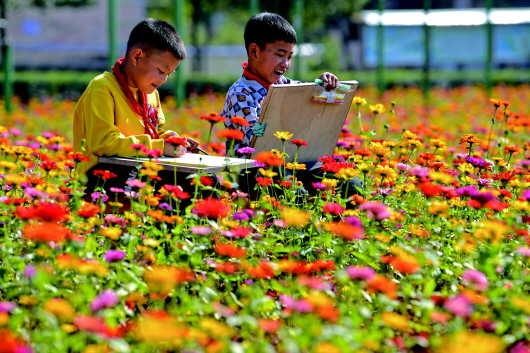 今年暑假刚刚到任江西省宜春市袁州区寨下镇中心小学的殷大福校长看着教学楼前一大片长满杂草的荒地,希望能在上面做点文章,让孩子们课后有个休闲活动的好去处。于是,他和老师们一起平整荒地,种下百日草的种子,开辟出花田和草坪。如今,昔日的荒地上已绽放出一片绚烂的花海,学生们的学习生活因此更加丰富多彩。美术课、十字绣兴趣小组的同学纷纷到花田边写生、采风,孩子们在绿地里玩耍训练。每周,殷大福校长还会组织不同班级的学生下田劳动,为鲜花松土、施肥、浇水,让他们亲身体验守护生活中美好的滋味。呵护、陪伴、欣赏……一颗颗真善美的种子在学生们的心底悄然种下。 新华社记者彭昭之摄