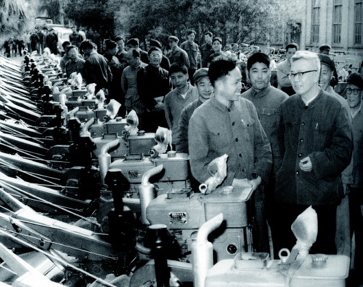 ▲1974年冬,华罗庚(前排右一)应邀到广西推广优选法、统筹法期间参观南宁手扶拖拉机厂。