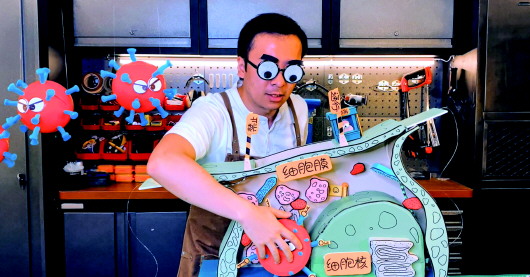 “新型冠状病毒在细胞外面游走过程中,总能找到对应的锁眼,咔嚓,打开细胞上的锁,天真的细胞误以为营养物质来了,于是大门敞开……”在一个约4分钟的视频中,宁原在工作间的长桌上用自己制作的病毒、细胞等模型,为粉丝趣味介绍新型冠状病毒是如何入侵人体的。他还邀请武汉大学医学部病毒学研究所专家来释疑病毒变异的相关问题,那期视频获得了500多万次观看量。