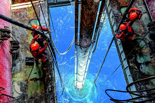 ▲工人在勘探三号上作业(7月27日摄)。 图片均由本报记者蒲晓旭摄