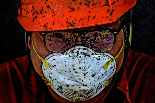 钻工闫共涛在倾倒一种钻井粉剂时戴上了N95口罩,这枚新口罩只戴了约40分钟就被汗水浸透,继而随着呼吸不断拱起和塌瘪。他的头顶和脚下,是无荫可避的海上烈日和被晒得发烫的钢铁甲板。
