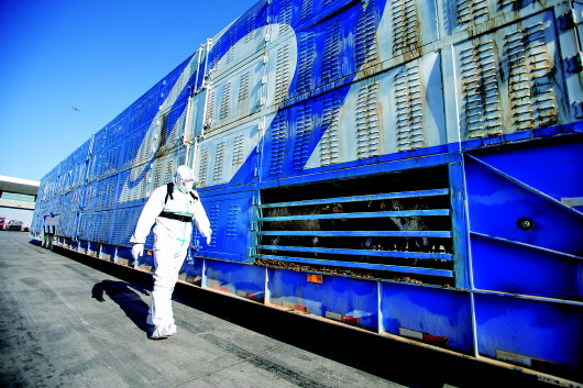 11月13日,内蒙古出入境边防检查总站二连出入境边防检查站执勤民警对载羊车辆进行车体检查。当日上午,载运最后一批1800只蒙古国捐赠羊的2辆货车在二连浩特口岸办理完通关手续,标志着历时23天、共14批次的蒙古国3万只捐赠羊全部入境。 新华社发(郭鹏杰摄)