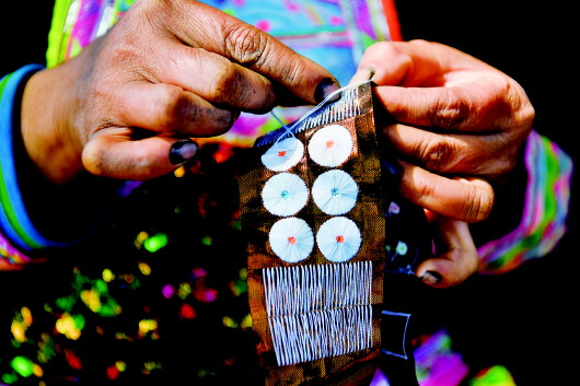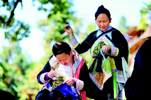 11月13日,苗族妇女在贵州省从江县岜沙苗寨创和刺绣基地学习刺绣。 |