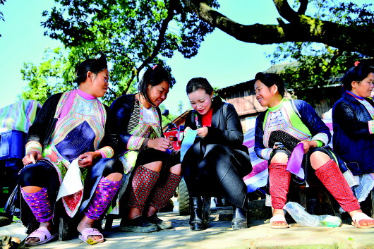 11月13日,在贵州省从江县岜沙苗寨创和刺绣培训基地,刺绣技能指导老师贾前梅(左三)在指导苗族妇女学习刺绣。 |