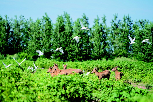 在位于湖南岳阳市的东洞庭湖麋鹿和鸟类救治避难中心拍摄的麋鹿和飞鸟(8月7日摄)。