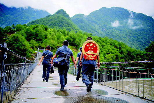 ▲云南省贡山县人民法院法官邓兴背着国徽与同事们跨过怒江(2019年8月30日摄)。为方便居住在高山峡谷里的农村群众,邓兴和同事们一起背着国徽,组建巡回法庭。每年足迹遍及50多个村镇,行程近万公里。新华社记者江文耀摄