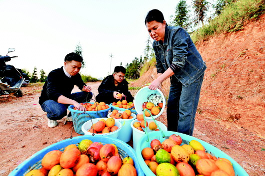 在从江县停洞镇东勤村,刘瑛(右)、贺常乐(中)与东勤村脱贫攻坚指挥所所长韦璐在帮助采收村集体种植的吊瓜(11月11日摄)。
