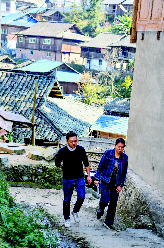 在从江县停洞镇东勤村,刘瑛(右)与东勤村脱贫攻坚指挥所所长韦璐在走访建档立卡贫困户途中(11月11日摄)。