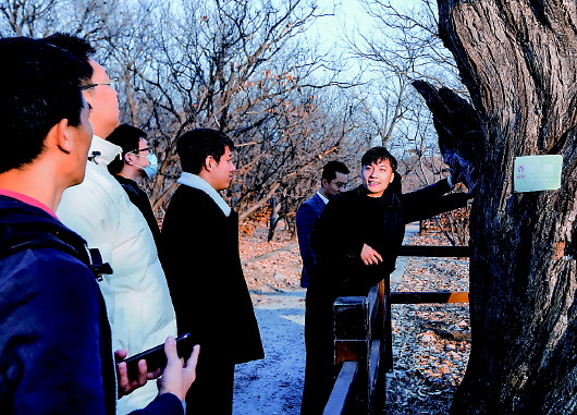 李思鹏(右一)在北京市怀柔区渤海镇明清栗园为参观者讲解(11月12日摄)。 新华社发 |