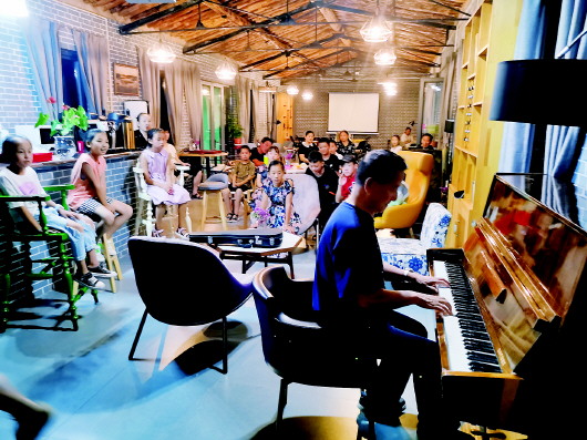 月色初上,咖啡吧里热闹非凡,涌泉庄孩子们的书法课正在进行中。给孩子们授课的是来自北京的大学教授李兴国,一位家学渊源的书法家。