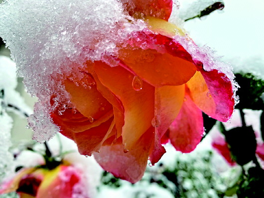 这是11月21日在北京郊区拍摄的花朵上的积雪。当日,北京迎来降雪。