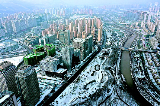 11月20日夜间,青海省东北部出现降雪、降温天气过程。雪后从空中俯瞰,高原古城西宁被白雪覆盖(11月21日摄)。 新华社记者吴刚摄