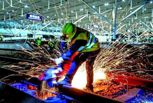 11月21日,中铁四局建设者在深圳北站改造工程现场切割铁轨。