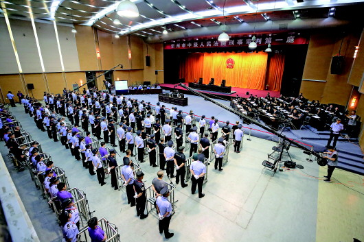 山西省忻州市中级人民法院依法公开开庭审理被告人朱强等59人涉嫌黑社会性质组织一案(2019年6月24日摄)。 新华社发 |