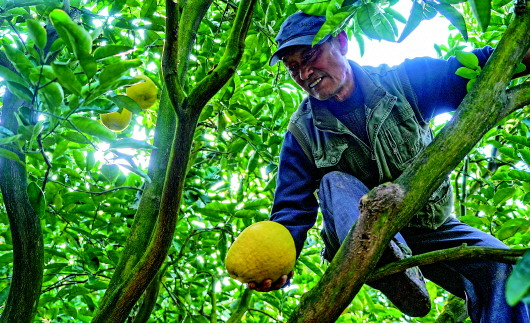 记者闻声拐进革新村一片柚子林,只见一个个柚子在林中斑驳阳光的照射下耀眼夺目。62岁的村民龙成民正在树下眯着眼睛,清点他的“宝贝疙瘩”。