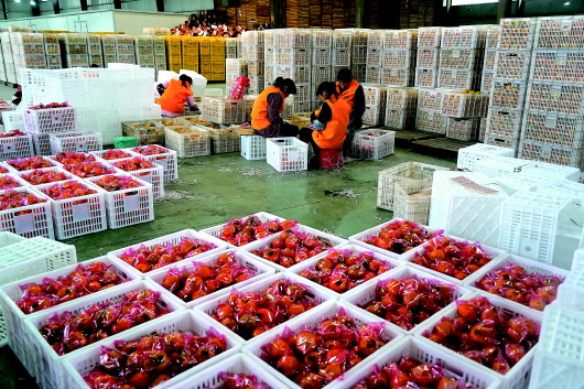 11月24日,在瑞金市叶坪乡一家脐橙专业合作社,果农包装脐橙准备发货。