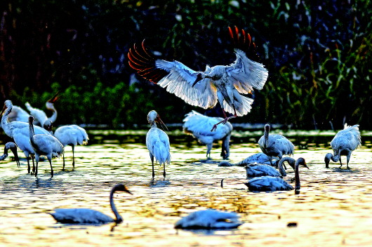 入冬以来,白鹤、天鹅等候鸟在鄱阳湖畔南昌五星白鹤保护小区的湿地中栖息觅食(11月18日摄)。      新华社记者万象摄