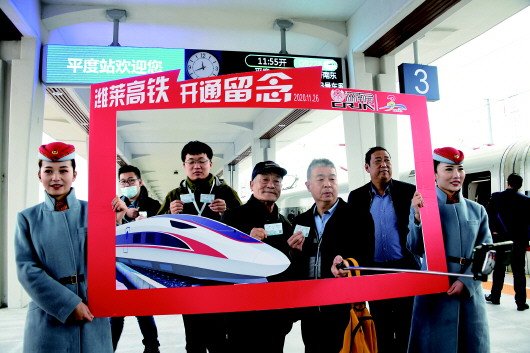 当日,山东潍荣高速铁路潍莱段(以下简称“潍莱高铁”)开通运营,山东省面积最大的县级市平度首通高铁,山东济南、青岛、烟台、威海、潍坊间的联系将更加便捷。潍莱高铁起自济青高铁潍坊北站,向东与青荣城际莱西站接轨,线路全长125.97公里,设计时速350公里,是山东“四横六纵”高速铁路网的重要组成部分。 新华社记者李紫恒摄