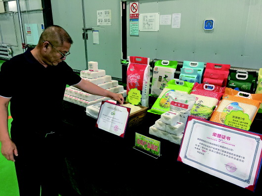 ▲2020年8月21日,蔡云楼在展示鲶鱼沟实业集团有限公司生产的大米产品。 |