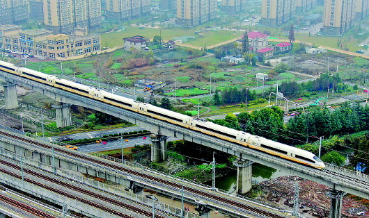 行驶在盐(城)(南)通高铁线上的动车组列车(11月27日摄)。当日,盐通高铁正式进入试运行阶段。 新华社发(许丛军摄)
