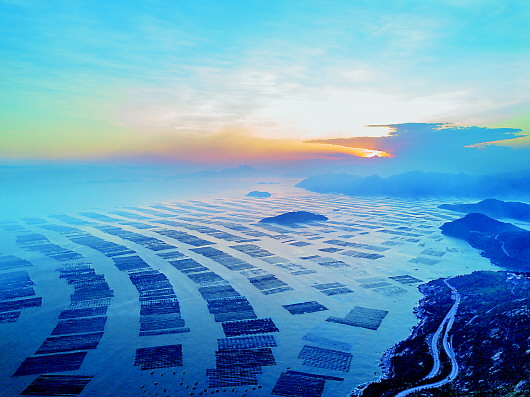 11月26日拍摄的福建省宁德市霞浦县三沙镇的紫菜“海上农场”。夕阳余晖中,渔船缓缓归港,海天一色,美不胜收。 新华社记者宋为伟摄