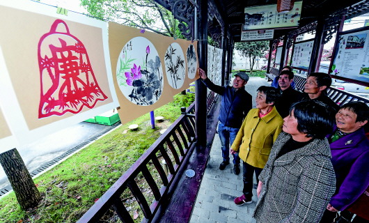 11月27日,龙岗镇新溪新村村民在观看以清廉文化为主题的书画展。